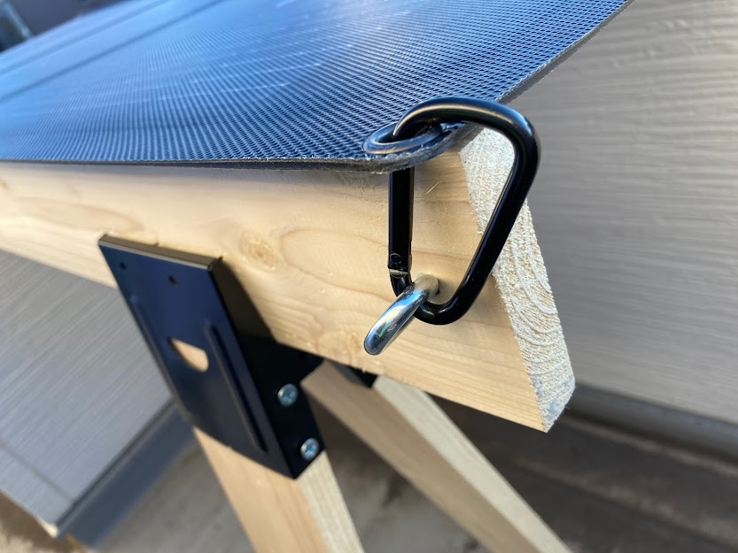 高さがある分、風の影響を受けやすくなっているので、パネルを乗せただけだとで煽られて落下してしまう可能性があり危ないので丸カンボルトで1x4の板とパネルを